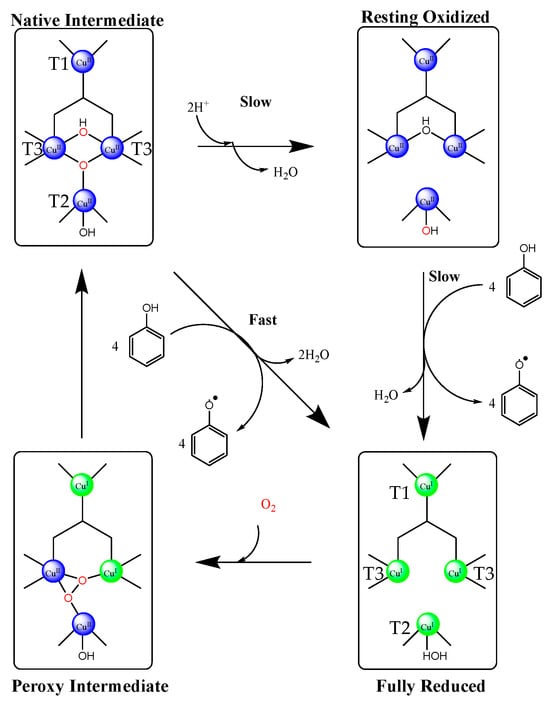 The catalytic mechanism of laccase has been thoroughly investigated through electron paramagnetic resonance spectroscopy and X-ray crystallography, allowing for the near complete elucidation of the enzyme active site function [124]. Of primary importance for understanding the laccase mechanism of action is the elucidation of the role T1, T2, and binuclear T3 copper centers play in the process. It is schematically presented in Scheme 2 [124].