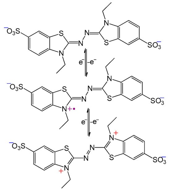 Oxidation of ABTS dianion (top) to the radical cation (middle), and finally to the dication (bottom).
