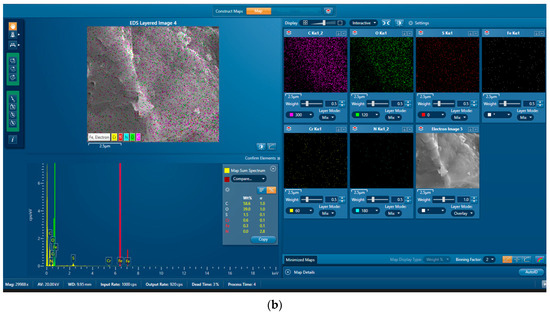 The textural properties of the adsorbent after adsorption of the Cr were also evaluated through SEM. The surface structure of the adsorbent did not significantly change after the adsorption process. Figure 3a,b shows SEM images of the ABP sample after Cr adsorption at magnifications of 1000 and 30,000, respectively.