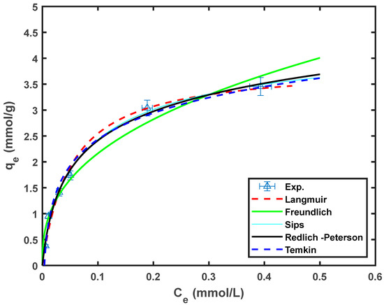 Non-linear regression fits of Equations (3)–(7) were performed using a custom-written MATLAB code. The parameters of the various isotherms are summarized in Table 5, and the fit of the model to the experimental data is shown in Figure 6.
