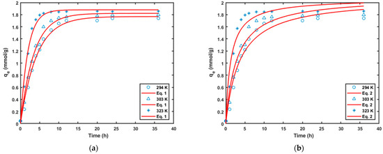Fit of the different models for the Cr(VI) removal kinetics data at different temperatures: (a) pseudo-first-order model, and (b) pseudo-second-order model.