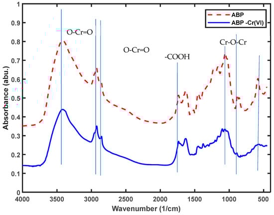 Banana peel comprises insoluble components such as hemicellulose, lignin, cellulose and pectin [34,35], along with some reductants capable of reducing Cr (VI) to Cr (III) under acidic conditions [17,36]. These reductants include polysaccharides, glycoproteins, glucolipids and nucleic acids. The lignin within banana peel may play a role in Cr3+ removal, as depicted in the schematic reaction shown in Figure 9. The changes in the functional groups after adsorption are shown Figure 10.