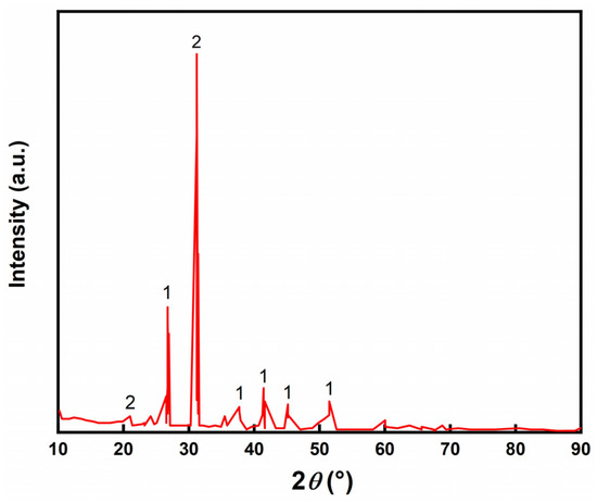 XRD pattern of LZT (1—dolomite; 2—quartz).