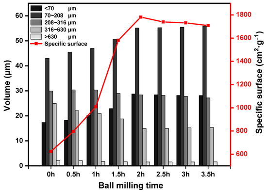 As can be seen in Figure 2, the particles of the LZT micropowder were refined by the process of mechanical force ball milling, and the percentage of particle size less than 70 μm increased from 17.32% to 28.74% of the original tailings. With the extension of ball milling time from 0.5 h to 2 h, the specific surface area of the LZT micropowder increased from 796.12 cm2/g to 1781.40 cm2/g. However, with the continued extension of the milling time, there was little change in the specific surface area, and the material appeared to be agglomerated, and the particle size increased instead. Therefore, the optimized grinding time for mechanical force activation was 2 h, at which time the specific surface area of the LZT micropowder was 1781.40 cm2/g.