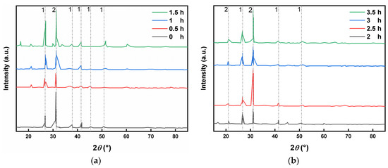 XRD patterns of LZT micropowder at different grinding times (1—dolomite; 2—quartz). (a,b) XRD characterisation of the mineral fraction of LZT micropowder before and after ball milling.