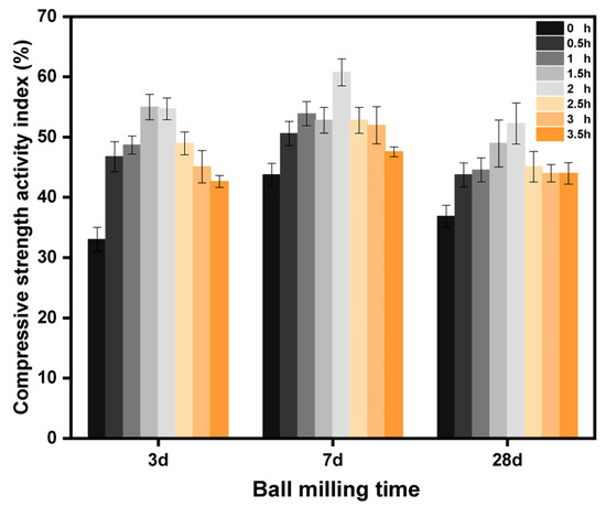 Table 2 shows the compressive strength of cemented sand specimens at 3 d, 7 d, and 28 d, obtained by mixing the LZT micropowder with benchmark cement in the same proportion and varying the ball milling time. Figure 4 illustrates the activity of the LZT micropowder at different ball milling times. Table 2 shows that the compressive strength of the composite system increased and then decreased with the increase in ball milling time. The early compressive strength increase was more obvious with the maintenance age growth. The change in the later 28 d compressive strength and 7 d compressive strength was not significant. The change rule in Figure 4 for the activity index was also the same. The finer particles and increased specific surface area resulting from ball milling LZT improved the hydration rate of the cement, allowing for a sufficient hydration reaction and ultimately increasing the compressive strength of the test pieces. However, when the ball milling time exceeds 2 h, the specific surface area increases, leading to a higher water requirement for the composite system. The remaining water evaporates after the cement hydration reaction, leaving behind numerous pores inside the specimen, which results in lower strength. Finally, as could be seen from Table 2, the COV gradually decreases with the increase in the number of days of curing. This signified that the compressive strength of the cured specimens became more stable and consistent. It also reflected that the stability and reliability of the compressive strength of the cured specimens increased.