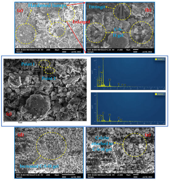 The SEM-EDS spectra at different conservation time (3 d, 7 d and 28 d). (a) shows a scanning electron microscope (SEM) image of the reaction product that appears to have hardened after 3 days of the filling slurry. A hydrated calcium silicate gel (C-S-H gel) is visible in (b), with a magnification of 1000. (c) is a local magnification of (b), and the elemental compositions of the two probes are given by energy-dispersive X-ray spectroscopy (EDS). (d) shows an SEM image of the 7-day specimen, with a magnification of 500. Calcite is attached to the C-S-H gel on calcite at a magnification of 1000. (f) is a local enlargement of (e) and displays the elemental composition of the two probes using EDS. (g) and (h) show the SEM microstructure of the specimen at 28 days. (i) is a local enlargement of (h) and displays the elemental composition of the two probes using EDS.
