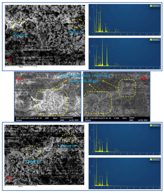 Figure 5a shows that the reaction products appeared and began to harden at 3 d of the fill slurry, with primary minerals accumulating and filling in between the whole tailings sand particles, cementing and adhering the whole sand particles and showing early strength. This was due to the formation of a small amount of needle-shaped material (calcovanadite). Figure 5b shows that although the production of calcovanadite favored the early strength of the filler, magnification revealed that the calcite crystals were small in diameter, incomplete and in the early stages of growth, while a small amount of amorphous C-S-H gel was seen. From Figure 5c, which shows the energy spectra of point scans 1 and 2, it can be seen that the filled slurry was mostly in the primary mineral phase (cordierite suspect, dolomite, etc.), with only a small amount of fibrous material (calcite) produced, and the bands and lumps were basically in the primary mineral phase. Figure 6d,e present the SEM microstructures of the 7-day specimen at the point of conservation, the latter being a magnified view. Additionally, Figure 5d shows that the amorphous C-S-H gel observed at 7 days also gradually increased. Furthermore, Figure 5e shows that by 7 days of maintenance, the calcovanadite crystal content increased, attached to the C-S-H gel, and intertwined with calcovanadite and all-tailed sand particles. The overall structure of the gel appears to be more compact at the point of 7 days. EDS confirmed the presence of primary minerals, including cordierite (as shown in spot scan 7), while calcovanillite attached to the C-S-H is generated, as shown in the results of spot scan 8. The SEM microstructure of the 28-day specimen is illustrated in Figure 5g and 5h, and the formation of calcovanadite was much larger in diameter and tightly and densely connected. The specimen contained interwoven calcovanite and amorphous C-S-H gel, which were closely connected to the tailing sand particles, creating a structure similar to reinforced concrete. The EDS analysis from Figure 5i showed the presence of a significant cross-network structure with a large number of C-S-H phases and needles/filaments (calcovanite), as well as a pronounced gel structure. Additionally, the analysis directly demonstrated the presence of calcite (spot scan 16) and C-S-H (spot scan 17).