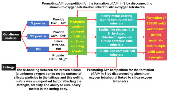 Wang et al. (2021) [18] demonstrated that depolymerizing silica-oxygen tetrahedra and aluminum–oxygen tetrahedra generated numerous reactive silica-oxygen tetrahedra in the system. These tetrahedra combined with Ca2+ ions in the liquid phase, forming more and more C-S-H gels, either as single silicate ions or as polymers of multiple silicate ions. Rodriguez-Navarro et al. (2015) [19] revealed that the formation of calcite necessitates a constant supply of Ca2+, OH−, and SO42− ions and divalent metal cations. These ions drive the reaction to continue and form a large number of calcite crystals that are extremely difficult to dissolve. Hou et al. (2023) [20] discovered that the average distance between silica-oxygen bonds is 0.160 nm, which is smaller than the sum of the radii of silica-oxygen ions. This indicates that the silica-oxygen bond has a covalent component and is not purely ionic. Thus, the bonding of silica-oxygen tetrahedra is relatively strong. When Ca2+ ions are added to the system, single silicate ions or polymers of multiple silicate ions combine with Ca2+ ions to form a large number of C-S-H gels. However, complex salt minerals containing heavy metals and those resembling calcite can cause the disconnection of aluminum–oxygen tetrahedral links from silica-oxygen tetrahedral links, as shown by experimental results [21]. Figure 6 shows that BFS provided Ca2+ and Al3+ ions, SS provided divalent metal cations and OH- ions, and DG provided Ca2+ and SO42−. The hydration reaction occurred on the tailings surface and slag micropowder, resulting in the formation of highly insoluble ettringite and driving the reaction to continue. The alumina-like complex salt minerals and calcite-like complicated salt minerals containing heavy metals raise the competition between Al3+ and silica-oxygen tetrahedra, leading to a disconnection in the slag. This process brings the reaction back to the hydration reaction centered on the tailings surface and slag micropowder, whilst also promoting the depolymerization of siloxo-tetrahedra and alumino-tetrahedra in BFS and SS.