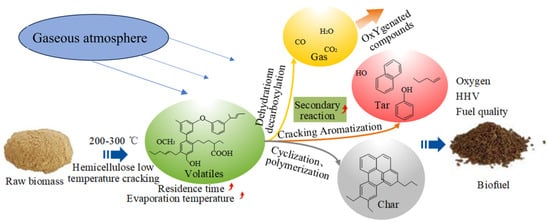Currently, energy consumption is highly dependent on traditional fossil fuels, with increased loads of carbon dioxide (CO2) and other greenhouse gases (GHGs). Traditional fossil fuels are causing widespread damage to the atmosphere and contributing to catastrophic global climate change []. The State Council issued a Circular on the State Council’s Action Program on Peak Carbon by 2030 in 2021, which states that new progress has been made in the research, development, popularization, and application of green and low-carbon technologies; that green production and lifestyles have been universally implemented; and that policy systems conducive to green, low-carbon, and recycling development have been further improved. To achieve a “carbon peak” and become “carbon neutral”, we should gradually reduce the consumption of fossil energy and, at the same time, effectively increase the proportion of renewable energy consumption []. With the development of national economy, energy consumption is gradually increasing and facing greater environmental pressure. As an important part of energy, biomass reserves are second only to the three major fossil energy sources. They have characteristics of renewability, low pollution, carbon neutrality, rich reserves and broad development prospects. They can not only relieve the energy pressure in China, but also reduce the carbon dioxide emissions of fossil energy, and help to achieve the goal of “double carbon” []. With the development of the rural economy and the increase in farmers’ income, straw burned in the traditional way has become the object to be replaced, resulting in the increase of straw in abandoned fields year by year. The widespread burning of straw has caused serious air pollution. Therefore, low-carbon energy derived from biomass has been developed to reduce the dependence on fossil energy. Roasting refers to a heat treatment method in which the temperature of biomass is in a low-oxygen or oxygen-free atmosphere. Lignin will be partially decomposed in roasting, and phenols are the most important volatile products, in addition to a small amount of acetic acid, ethanol, formaldehyde, etc. Roasting is a process to upgrade waste lignocellulose (so not in competition with food), aiming towards multiple products such as chemicals, char, and also fuels. Light aromatic hydrocarbons, such as benzene, toluene, and xylene, are important raw materials in the production of various industrial products, such as plastics, resins, solvents, and pharmaceuticals. Biomass roasting not only removes the water content but also produces several derivatives. To cut costs, it is essential to make full use of roasted biomass as a by-product of the treatment process. Various pretreatment techniques may be improved and combined to overcome the limitations of a single method, resulting in synergies.