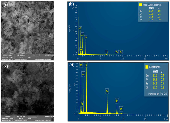 The morphological structure of the synthesized Fe3O4@SiO2@ZnO and Fe3O4@SiO2@ZnO* composites was observed using scanning and electron microscopy (SEM). The results of the SEM and Energy-dispersive X-ray spectroscopy (EDXS) analyses of the composites are presented in Figure 1. It can be seen that both composites display spherical particles. The size of these particles is difficult to determine, but they form agglomerates with a diameter of 400–500 nm (Figure 1a). According to [31], the SiO2 coating on the magnetite Fe3O4 surface could lead to the formation of a granular surface, whereas the ZnO coating might result in the agglomeration of composites and cause deformations in the particles. The EDXS analysis (Figure 1b) confirmed the presence of iron, silicon, zinc, and oxygen in the synthesized Fe3O4@SiO2@ZnO composite. According to the EDXS data, the distribution of elements changed slightly, indicating a higher amount of iron after activation (Figure 1d). Additionally, the reaction with H2O2 can cause physical changes in the composite, such as delamination, cracks, or pores, which can alter the way elements are distributed or appear on the surface.
