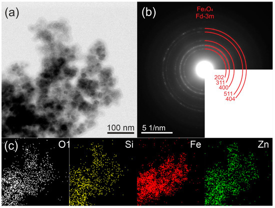 The selected-area electron diffraction (SAED) pattern, which is shown in Figure 2b, confirmed the polycrystalline character of the sample and corresponds with the results of the XRD. The SAED analysis revealed distinctive peaks associated with the crystalline planes (202), (311), (400), (511), and (404) of magnetite Fe3O4. Notably, no discernible peaks corresponding to the hexagonal structure of ZnO were observed. Moreover, the SAED pattern exhibited a diffuse halo, suggesting the amorphous nature of ZnO and SiO2. The EDX maps in Figure 2c showed that the distributions of Fe, Si, Zn, and O were uniform.