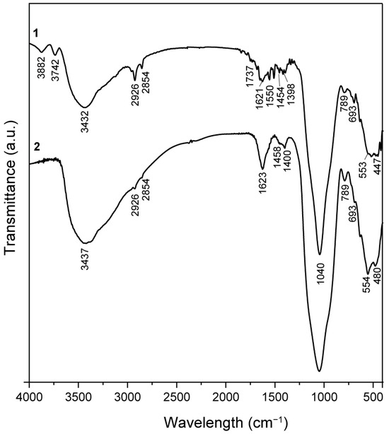 The infrared spectra of the synthesized Fe3O4@SiO2@ZnO and Fe3O4@SiO2@ZnO* composites are shown in Figure 4. Firstly, the initial sample (spectrum 1) contained bands at 3882 cm−1 and 3742 cm−1, attributed to the stretching vibrations of O–H. There were also bands at 693 cm−1, relevant to -OH bending vibrations, which indicated the presence of free -OH groups on the surface of oxides. Concurrently, following the activation of the sample in an aqueous environment, these bands became indistinct or disappeared entirely. This effect was attributed to the substantial presence of water on the surface, as evidenced in spectrum 2. The wide absorption band centered at 3432 cm−1 corresponded to the O–H stretching modes of surface-adsorbed molecular water [34] at both spectra. The peaks in the region of 2973–2854 cm−1 were related to the symmetric and asymmetric stretching vibrations of –CH3 and –CH2 groups [31,43] from non-hydrolyzed residues of the starting substances. The low-intensity bands located at 1737 cm−1 and ~1400 cm−1 were assigned to the stretching vibrations of C=O and the bending mode of C–O–H, respectively [31,44], from carboxyl groups on the ZnO surface.