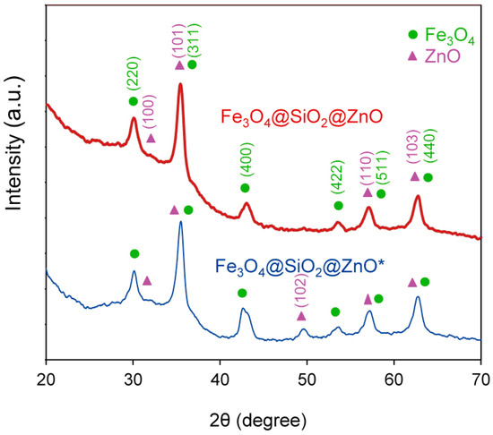 The XRD pattern of the modified composite exhibited the same features as the initial composite, indicating that the Fe3O4@SiO2@ZnO phase was maintained after activation. The average crystallite sizes of Fe3O4@SiO2@ZnO and Fe3O4@SiO2@ZnO* were determined to be 20 nm and 19 nm, respectively, using the Debye–Scherrer equation. Given that the size of the magnetite was 12.5–14.2 nm [50,51], a shell was present but was not large enough to produce silica peaks in the 21 degree 2θ region of the diffractograms [51]. These data correlate with the EDXS data and confirm the presence of iron on the surface that is not covered by shells.