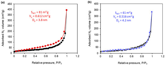 N2 adsorption–desorption measurements were carried out to study the textural properties of the synthesized Fe3O4@SiO2@ZnO composite and to compare them with those of its hydrogen peroxide-modified form, Fe3O4@SiO2@ZnO*. The N2 adsorption–desorption isotherms for both the Fe3O4@SiO2@ZnO and Fe3O4@SiO2@ZnO* composites are presented in Figure 6. These isotherms displayed typical type II characteristics with an H3 hysteresis loop according to IUPAC, indicating the presence of mesopores in the samples [35,37]. The textural properties of the tested composites, including the BET surface area (SBET), total pore volume (Vp), and mean pore diameter (Dp), are listed in Figure 6. The BET surface areas of the Fe3O4@SiO2@ZnO and Fe3O4@SiO2@ZnO* composites were 81 m²/g and 61 m²/g, respectively, the pore sizes were 3.8 nm and 4.2 nm, and the total pore volumes were 0.61 cm³/g and 0.52 cm³/g, respectively. It is evident that the textural parameters for both composites were similar, with only a slight decrease in the BET surface area for the modified composite. This decrease could be attributed to the thickening of agglomerates caused by the redistribution of charges on the surface, leading to an increase in the space between pores. Consequently, the Fe3O4@SiO2@ZnO and Fe3O4@SiO2@ZnO* composites are characterized as non-porous, possessing a sorption volume formed by aggregated nanoparticles, with gaps and holes between the particles and agglomerates forming the pores.