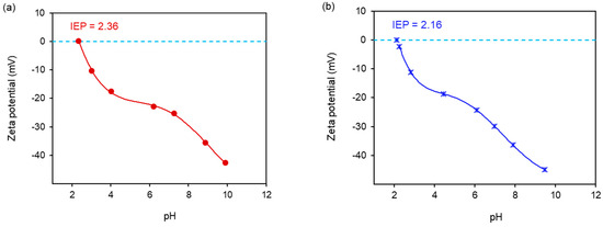 The results of the zeta potential test, as a function of pH values for the two composites, are presented in Figure 7. The zeta potential values for Fe3O4@SiO2@ZnO and Fe3O4@SiO2@ZnO* were similar, falling within the ranges of −42.7 mV < ζ < 0 mV and −45.0 mV < ζ < −2.4 mV, respectively. These results indicate instability and a tendency for particles to agglomerate in both composites. An increase in pH led to a decrease in the zeta potential of Fe3O4@SiO2@ZnO and Fe3O4@SiO2@ZnO* (Figure 7), making the surfaces of the samples more negatively charged. This suggests that the particles of the composites are negatively charged due to the presence of anionic groups on their surfaces. This finding is consistent with the literature, which explains that the increase in OH− ions [52,53] leads to the formation of negatively charged Si-OH [51] and/or Zn(OH)3− and Zn(OH)42− or (≡Zn–O−) [54] on the composite surface. Additionally, the IR data confirmed the presence of –OH groups from oxides on the surface. The isoelectric points (IEPs) of Fe3O4@SiO2@ZnO and Fe3O4@SiO2@ZnO* were determined to be 2.36 and 2.16, respectively, indicating acidic pH values. In the case of the modified composite, the IEP was determined by interpolating the curve to zero on the pH scale from the zeta potential measurements.