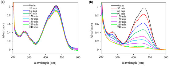 The changes in the absorption spectra of the MO solution over time, in the process of a photodegradation reaction using Fe3O4@SiO2@ZnO and Fe3O4@SiO2@ZnO*, are presented in Figure 9. The characteristic absorption peak of MO at 460 nm slightly decreased for Fe3O4@SiO2@ZnO, whereas for Fe3O4@SiO2@ZnO*, it continued to decrease over time and ultimately disappeared completely after 240 min. This indicates the complete removal of the azo dye using the modified composite as a photocatalyst.