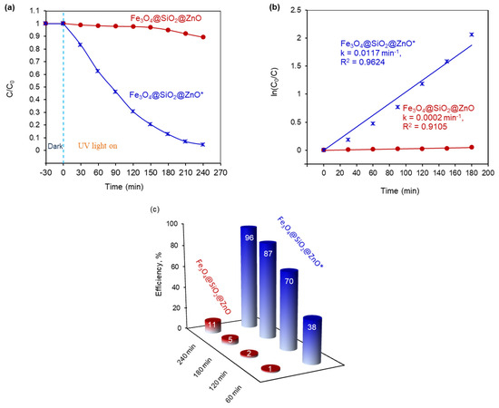 The corresponding kinetic curves for MO degradation and the MO removal efficiencies over time are presented in Figure 10a,c. It is observed that, for Fe3O4@SiO2@ZnO, the photodegradation of MO is extremely slow, with degradation efficiencies of only 1% after 60 min, 2% after 120 min, 5% after 180 min, and 11% after 240 min. In contrast, the modification of the composite significantly enhanced azo dye removal, achieving degradation efficiencies of 38%, 70%, 87%, and at least 96% for 60, 120, 180, and 240 min, respectively. Therefore, the MO removal efficiency for Fe3O4@SiO2@ZnO* over 240 min was 8.7 times higher than that of Fe3O4@SiO2@ZnO.