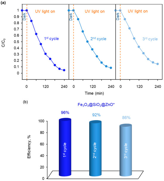 The reusability of the more active photocatalyst Fe3O4@SiO2@ZnO*, following the photodegradation of MO, was investigated over three cycles and is presented in Figure 11. As illustrated in Figure 11b, the catalyst exhibited a decrease in performance from 96% in the first cycle to 92% and 86% in the second and third cycles, respectively. Therefore, the photocatalytic efficiency decreased slightly after each run but still achieved a value of 86% after three cycles. The obtained results indicate that Fe3O4@SiO2@ZnO* exhibits good cycling stability.