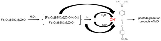 Based on the obtained results and an analysis of the literature [9,28,31,38,39,57], a possible mechanism for the photocatalysis of MO by Fe3O4@SiO2@ZnO* is proposed, as illustrated in Figure 13.