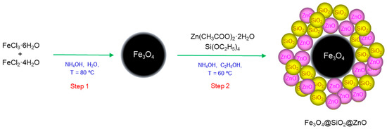 Schematic illustration of the two-step synthesis of the Fe3O4@SiO2@ZnO composite.