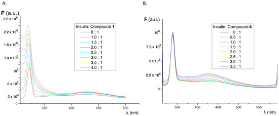3.6. Fluorescence Studies of Fluorene Sensors Interaction with Native Insulin Protein