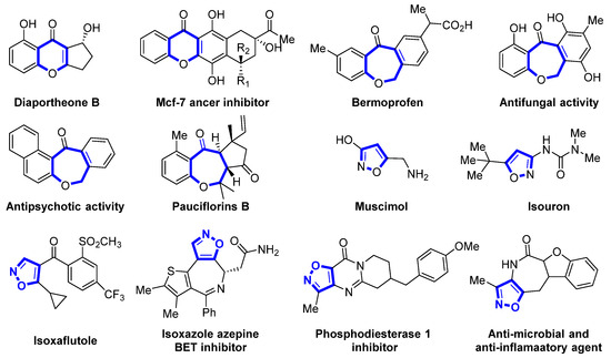Some drugs with pharmacological activity containing benzo[b]oxygenes or isoxazole frameworks.