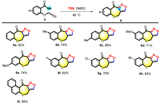 Next, substrate 5 was explored to obtain a series of derivatives with an isoxazole structure, and the reaction conditions were further optimized for the synthesis (Table S4). The scope of 6 was studied under the optimal conditions. As shown in Figure 4, substrate 5a was smoothly transformed into the corresponding product with a yield of 82%. A series of 5 with different substitutions (4-Me, 5-Me 4-OMe, and 4-OMe) was investigated. The desired products 6b–6e were obtained with 68%-75% yields. The 1-(2-(prop-2-yn-1-yloxy)phenyl)ethan-1-ones (5f–5h) attached with halogen atoms (e.g., 5-F, 5-Cl, and 5-Br) were also tolerated in the reaction, yielding the corresponding products 6f–6h with 62%-83% yields. Substrate 5i was also found to be suitable for this reaction, giving the desired product 6i with an 85% yield.