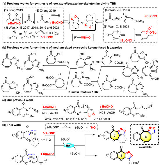 Reactions employing tert-butyl nitrite (TBN) as both a free radical initiator and N–O fragment donor have emerged as an important tool for isoxazole/isoxazoline synthesis over the past few years [20,21,22,23,24,25,26]. Song et al. developed a new [2 + 1 + 1 + 1] annulation reaction of sulfoxonium ylides with TBN for the first time to synthesize furoxans and isoxazoles [27]. Zhang et al. reported the graceful synthesis of isoxazoles from methyl ketones, terminal alkynes, and TBN under catalyst-free conditions [28]. Wan, X.-B. et al. reported the graceful cycloaddition reactions for the synthesis of isoxazoles from diazo compounds or N-tosylhydrazones with alkenes or β-keto esters activated by tert-butyl nitrite [29,30,31]. These approaches are robust and can deliver fully substituted isoxazoles. In a recent study, Wan, J.-P. et al. reported a refined metal-catalyzed strategy for the synthesis of isomeric isoxazoles through the reactions of enaminones, diazo compounds, and TBN under different Cu- and Ag-catalyzed conditions [32]. The synthesis of isoxazoline-fused bicyclic compounds poses challenges, particularly under transition-metal-free conditions. Instead, Wan, X.-B. et al. used intramolecular acyclic nitronate olefin cycloaddition reactions via the in situ generated acyclic nitronates combined with cascade [3 + 2] cycloaddition and tert-butyloxy group elimination to enable the formation of diverse γ-lactone-fused isoxazolines and even tricyclic isoxazolines (Scheme 1a) [33]. A metal-free method had already been used to synthesize 3-methyl-1,8-dihydrocycloheptapyrazol-8-one derivatives and isoxazole-fused seven-membered oxacyclic ketones by Imafuku in 1982 (Scheme 1b) [34].