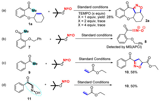 Control experiments. (a) Radical capture. (b) Formation of intermediate 8. (c) Formation of 4,5-dihydroisoxazole 8b via intermolecular cycloaddition under standard conditions. (d) Formation of 10 from intermediate 11 under standard conditions.