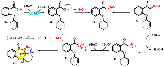 Based on the evidence presented above and the related literature [28,35,36,39,40,41], a plausible reaction pathway was proposed (Scheme 3). First, TBN was transformed into NO and tBuO radicals through thermal homolysis. The substrate 1a underwent hydrogen abstraction with the tBuO radical to afford intermediate A. Then, intermediate A and the NO radical performed radical cross-coupling to produce intermediate B. Intermediate B underwent tautomerization to generate oxime C, which was further conducted two times via hydrogen abstraction with the tBuO radical to generate the nitrile oxide intermediate E. Finally, the nitrile oxide intermediate E underwent 1,3-dipolar cycloaddition with an intramolecular alkene to produce the final product 2a.