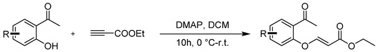 Compounds 3a–3q were prepared according to the referenced literature [39,40]. To a solution of 1-(2-hydroxyphenyl)ethan-1-one) (1.0 equiv.) and DMAP (0.1 equiv.) in CH2Cl2 (0.1 M), a solution of ethyl acetylenecarboxylate (2.0 equiv.) was added dropwise at room temperature and stirred for 10 h. After the reaction was completed, 50 mL of water was added to the mixture and then extracted with DCM 3 times (3 × 50 mL). The extract was dried over anhydrous Na2SO4 and concentrated under reduced pressure. The crude residues were purified by column chromatography using an ethyl acetate/petroleum ether mixture to obtain the desired products (Scheme 5).