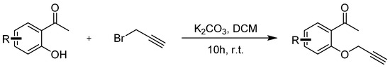 Compounds 5a–5i were prepared according to the referenced literature [43,44,45]. To a solution of 1-(2-hydroxyphenyl)ethan-1-one) (1.0 equiv.) and K2CO3 (3.0 equiv.) in CH2Cl2 (0.1 M), a solution of 3-bromoprop-1-yne (2.0 equiv.) in CH2Cl2 (0.5 M) was added dropwise at room temperature and stirred for 10 h. After the reaction was completed, 50 mL of water was added to the mixture and then extracted with DCM 3 times (3 × 50 mL). The extract was dried over anhydrous Na2SO4 and concentrated under reduced pressure. The crude residues were purified by column chromatography using an ethyl acetate/petroleum ether mixture to obtain the desired products (Scheme 6).