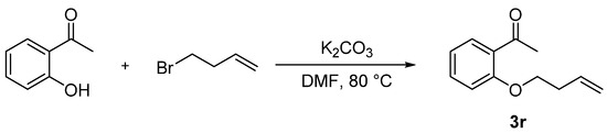 Compound 3r was prepared according to the referenced literature [46]. To a solution of 1-(2-(but-3-en-1-yloxy)phenyl)ethan-1-one (1.0 equiv.) and K2CO3 (1.0 equiv.), a solution of 4-bromo-1-butene (1.2 equiv.) in DMF (4 mL) was added dropwise at 80 °C and stirred for 24 h. After the reaction was completed, 50 mL of water was added to the mixture and then extracted with DCM 3 times (3 × 50 mL). The extract was dried over anhydrous Na2SO4 and concentrated under reduced pressure. The crude residues were purified by column chromatography using an ethyl acetate/petroleum ether mixture to obtain the desired products (Scheme 7).