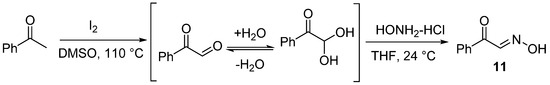 Compound 11 was prepared according to the referenced literature [36,41]. A mixture of acetophenone (1.0 equiv.) and I2 (1.6 equiv.) was reacted under 110 °C for 10 h. Phenyl glyoxal was afforded without further purification. Then, hydroxylamine hydrochloride (1.0 equiv.) was added to a solution of phenyl glyoxal in THF (40 mL), and the reaction mixture was reacted under 24 °C for 12 h. After the reaction was completed, 50 mL of water was added to the mixture and then extracted with EtOAc 3 times (3 × 50 mL). The extract was dried over anhydrous Na2SO4 and concentrated under reduced pressure. The crude residues were purified by column chromatography using an ethyl acetate/petroleum ether mixture to obtain the desired product (Scheme 9).