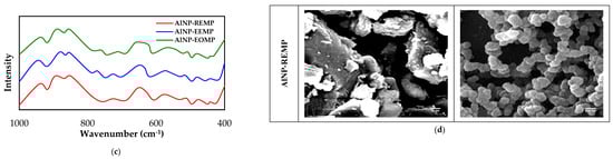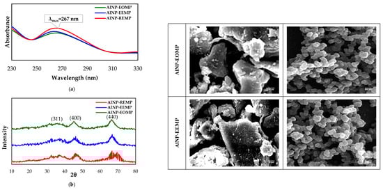 After the process of preparing the three γ-Al2O3 nanoparticles, namely AlNP-EOMP, AlNP-EEMP, and AlNP-REMP (alumina nanoparticles (Al2O3), derived from the essential oil, ethanol extract, and residue of the Mentha pulegium plant, respectively, physicochemical analyses were carried out to provide information on the overall composition, structure, and morphology of these materials. Figure 1 presents the physicochemical characterization of the synthesized γ-Al2O3, including (a) UV-VIS, (b) XRD patterns, (c) FTIR spectroscopy, and (d) SEM.