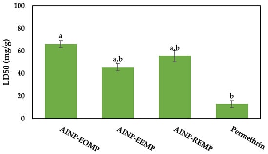 Assessment of the insecticidal efficacy of the γ-Al2O3 nanoparticles was conducted against the Xylosandrus crassiusculus strain from region 1 (Had Bouhssoussen). Figure 2 illustrates the lethal doses 50 of the three variations in the γ-Al2O3 nanoparticles, namely AlNP-EOMP, AlNP-EEMP, and AlNP-REMP (alumina nanoparticles (Al2O3), derived from the essential oil, ethanol extract, and residue of the Mentha pulegium plant, respectively), alongside the positive control Permethrin, a commercially available insecticide renowned for its effectiveness against wood-eating beetles. The findings reveal that the AlNP-EEMP and AlNP-REMP nanoparticles, derived from the ethanolic extract and residue, respectively, exhibit notable activities compared to Permethrin, surpassing the effectiveness of the essential-oil-based AlNP-EOMP nanoparticle.