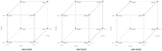 We used statistical experimental designs as a method to minimize the experimental conditions for insect mortality of Xylosandrus crassiusculus in region 1 under the LD50 parameter. The design matrix used for this purpose was a full factorial design based on three Xi factors (Table 1). All factors have two levels, with a high level coded as +1 and a low level coded as −1. The numbers of tests for the k factor are seen in Table 6 [58].