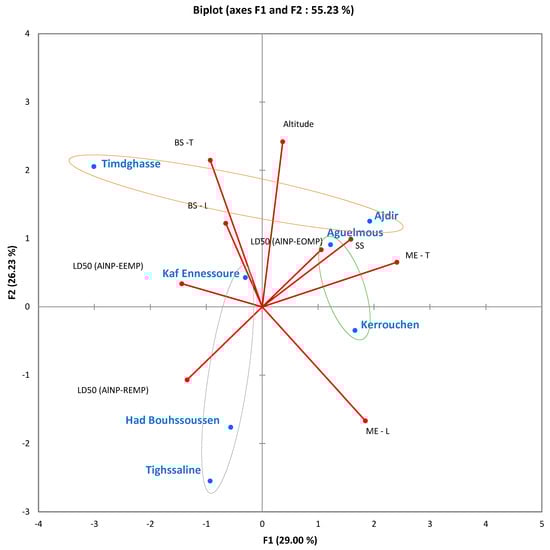 Principal Component Analysis (PCA), a multivariate statistical technique [59,60], was utilized to investigate the relationship between the insecticidal properties of the synthesized nanoparticles and the mechanical attributes of the carob beetle panels affected by insects concerning the geographical origin of the strains under study. The research monitoring was carried out on the resulting matrices obtained during the optimization phase in the seven regions of Khenifra. The analysis incorporated seven variables, namely geographical altitude (h), lethal dose 50 (LD50), shear strength (SS), and bending strength in the longitudinal direction (BSLD) and the transverse direction (BSTD), as well as the modulus of elasticity in the longitudinal direction (MELD) and in the transverse direction (METD). The objective was to establish associations between these variables and identify any recurring patterns or trends that could provide insights into the effectiveness of the prepared products against carob wood pests.