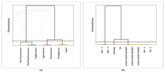 Ascending Hierarchical Classification (HAC) of geographical, insecticide, and mechanical data from seven regions of Khenifra. (a) Forest clustering and (b) parameter clustering. (Each color represents a set of qualitative variables sharing similar characteristics).