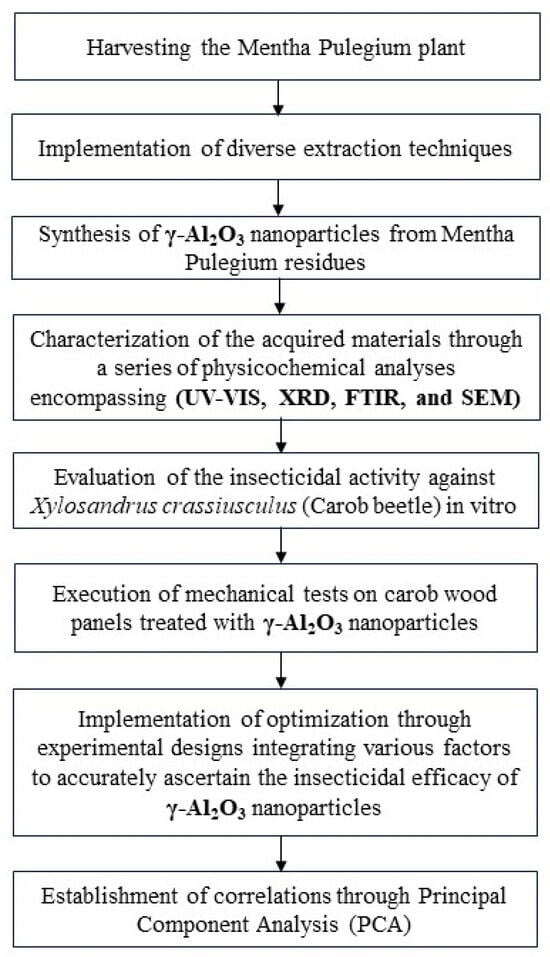 The operational procedure for assessing and enhancing the insecticidal properties of the γ-Al2O3 nanoparticles derived from Mentha pulegium residue against Xylosandrus crassiusculus (carob beetle) was conducted in accordance with the subsequent steps: (1) Harvesting the Mentha pulegium plant. (2) Implementation of diverse extraction techniques to obtain different extracts. (3) Synthesis of the γ-Al2O3 nanoparticles from the Mentha pulegium residues utilizing an appropriate methodology. (4) Characterization of the acquired materials using a series of physicochemical analyses encompassing UV-Vis, XRD, FTIR, and SEM. (5) Evaluation of the insecticidal activity against Xylosandrus crassiusculus (Carob beetle) in vitro. (6) Execution of mechanical tests on carob wood panels treated using γ-Al2O3 nanoparticles, followed by exposure to insect strains. (7) Implementation of optimization using experimental designs integrating various factors to accurately ascertain the insecticidal efficacy of the γ-Al2O3 nanoparticles. (8) Establishment of correlations using Principal Component Analysis (PCA) between data from the seven regions investigated, including geographical altitude and insecticidal data from γ-Al2O3 nanoparticles, as well as the characteristics of the mechanical tests on the carob wood treated with the γ-Al2O3 nanoparticles. The subsequent sub-sections meticulously outline all the methodologies and tests conducted (Figure 6).