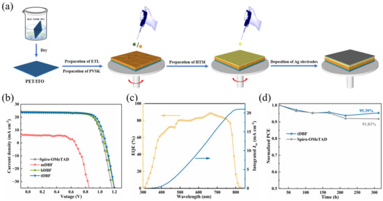 - Xia, J.X.; Luizys, P.; Daskeviciene, M.; Xiao, C.X.; Kantminiene, K.; Jankauskas, V.; Rakstys, K.; Kreiza, G.; Gao, X.X.; Kanda, H.; et al. Foldable hole-transporting materials for merging electronic states between defective and perfect perovskite sites. Adv. Mater. (Weinh. Ger.) 2023, 35, 2300720. [Google Scholar] [CrossRef]