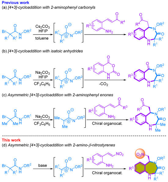 We recently reported research detailing synthetic methods for 1,4-benzodiazepinone through the utilization of a [4+3]-annulation approach involving azaoxyallyl cations [20,21,22,23]. We successfully achieved the one-pot synthesis of 1,4-benzodiazepine-3-ones by conducting aza/aza-[4+3]-cycloadditions of α-halohydroxamates with 2-aminophenyl α,β-unsaturated phenyl ketones. This reaction employed Cs2CO3 as the base and hexafluoroisopropanol (HFIP) as an additive, resulting in the formation of 1,4-benzodiazepine-3-ones in good yields (Scheme 1a) [20]. We also developed a [4+3]-annulation reaction involving in situ-generated azaoxyallyl cations and isatoic anhydride, leading to the synthesis of seven-membered 1,4-benzodiazepinediones in moderate to good yields. This reaction involves a sequential cascade, encompassing decarboxylative addition of HFIP to isatoic anhydride, addition to azaoxyallyl cation, and intramolecular substitution, ultimately yielding 1,4-benzodiazepinediones (Scheme 1b) [21]. In addition to these advancements, we reported an organocatalytic asymmetric [4+3]-cycloaddition of 2-aminophenyl α,β-unsaturated carbonyls with in situ generated azaoxyallyl cations. In this asymmetric reaction, we obtained enantioenriched functionalized seven-membered 1,4-benzodiazepine-3-ones in good yields and with excellent enantioselectivities (Scheme 1c). Furthermore, several of the resulting compounds displayed promising bioactivity in the prevention of peripheral nerve degeneration [23]. Continuing our exploration of organocatalytic asymmetric [4+3]-cycloaddition reactions for the synthesis of enantioenriched 1,4-benzodiazepine-3-ones, we present our achievement in the asymmetric [4+2]-cycloaddition of 2-amino-β-nitrostyrenes and α-bromohydroxamates (Scheme 1d). We anticipate that the resulting compounds will serve as a valuable foundation for the synthesis of diverse compounds, potentially enhancing their bioactivity by facilitating the conversion of the nitro group.