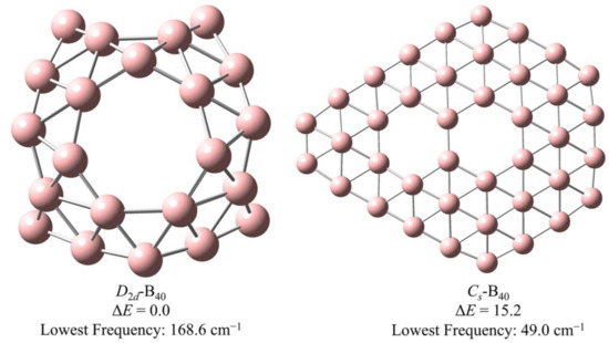 Geometries of D2d-B40 and Cs-B40 optimized on the TPSSh/6-31G* theoretical level, including their relative energy in kcal/mol and lowest frequency.