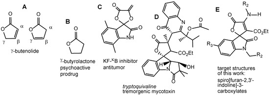 (A) basic γ-butenolide structures. (B) γ-butyrolactone. (C) a spiro-cyclic furan-indoline KF-κB inhibitor. (D) tryptoquivaline, a mycotoxin (E) Target structures of this work.