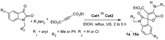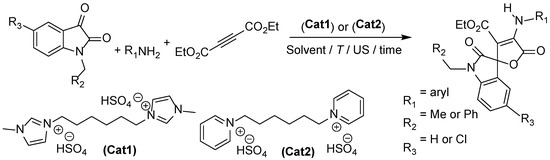 In continuation of our recent work using a heterogeneous sulfonic acid polyvinyl pyridinium IL catalyst for multi-component synthesis of spiroindole-3,5-pyrano[2,3-d]pyrimidines and pyrazines [41], we report herein the synthesis of spiro[furan-2,3′-indoline]-3-carboxylate derivatives using the two easy-to-make and versatile homogeneous Brønsted-acidic IL catalysts Cat1 and Cat2 in three-component reactions using isatin (N-alkyl-indoline-2,3-dione) derivatives, anilines, and diethyl acetylenedicarboxylate (Scheme 2). The use of ultrasonic irradiation was motivated by our own experience with such multi-component reactions suffering from limited miscibility of the components due to their different hydrophilic/hydrophobic properties and the wish to use only one solvent.