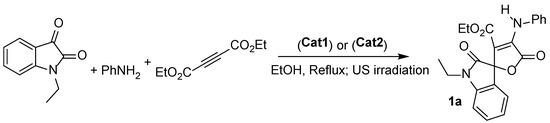 First, the synthesis of 1a from the reaction of 1-ethylindoline-2,3-dione (1 mmol), aniline (1 mmol), and dimethylacetylenedicarboxylate (1 mmol) was studied under ultrasonic (US) irradiation, varying solvent, catalyst amounts, and temperature (Scheme 3). Without the catalyst and when the reaction was stirred at ambient temperature (r.t.) for 24 h, no product was obtained (Table 1). Similarly, when the reaction was heated at 80 °C under the solvent-free condition the substrates remain unreacted even after prolonged heating (24 h). Next the reaction was investigated under reflux conditions, and we found no product formation below 60 °C; among the solvents, EtOH was found to be suitable. Finally, we found that 30 mol% of the ionic liquid catalyst shows optimum performance with yields of 96% or 88% using Cat1 or Cat2, respectively (Table 1).