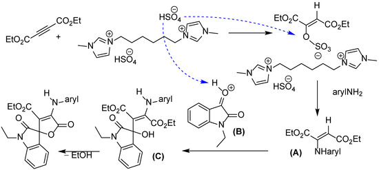 Mechanistically, the reaction is supposed to start via the sulfonation of the triple bond of the acetylenic ester and the subsequent replacement of the OSO3 group by the amine. Thus, diethyl 2-(phenylamino)fumarate is obtained as the intermediate (A). At the same time, 1-ethylindoline-2,3-dione is activated by ionic liquid through protonation at the 3-oxo group (B). The nucleophilic reaction of diethyl 2-(phenylamino)fumarate (A) with the protonated 1-ethylindoline-2,3-dione (B) gives the intermediate (C) which undergoes a cyclization reaction and elimination of EtOH (Scheme 4), while the catalyst is recycled.