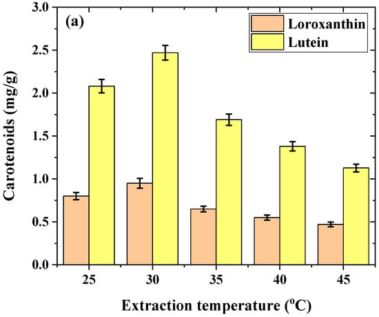 Temperature is an important factor affecting extraction. While moderate heat can enhance solubility and diffusion rates, thus initially improving extraction efficiency, excessive temperatures often lead to the thermal degradation of carotenoids []. These pigments are susceptible to isomerization and oxidation at high temperatures, which not only reduces their overall yield but also affects their quality and nutritional value. It is essential to select the optimum temperature to achieve a high extraction rate; hence, the influence of temperature on the quantities of extracted loroxanthin and lutein was also investigated. The findings of this study are displayed in Figure 1a. The extraction temperatures were adjusted to 25, 30, 35, 40, and 45 °C.