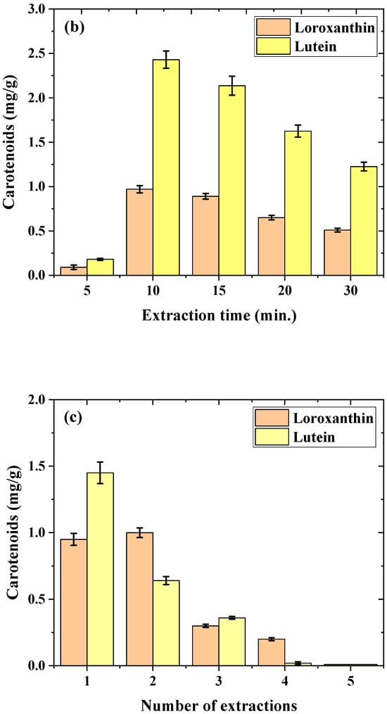 The number of extraction cycles significantly influences the amount of carotenoids extracted from microalgae. In general, multiple extraction steps can lead to a higher cumulative yield of carotenoids. In this study, the effect of the number of extractions on the loroxanthin and lutein yield is presented in Figure 1c. Based on the results, three extractions seemed to be enough for high carotenoid yields.